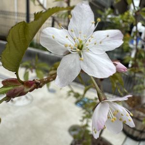 自治体から、子どもが生まれた記念にもらった、やまざくらが本日咲きました。 3年目で初めて開花しました。 3輪だけですが、とても嬉しい。 来年はもっと咲いてくれるかな