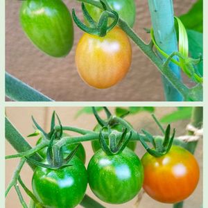 ミニトマトが色付いてきました😊 2枚目は超うす皮・つやぷるん🍅 朝顔各種、ローゼル、ツルなしインゲンの🌱🌱🌱 オレンジの百合2種🧡🧡🧡