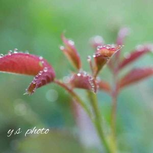 今朝、開く前の薔薇の葉についた雫が、あまりに綺麗だったので、思わずパシャリ