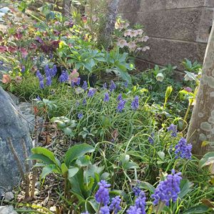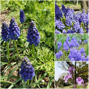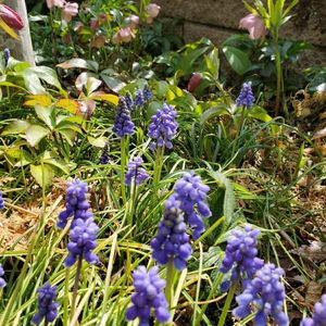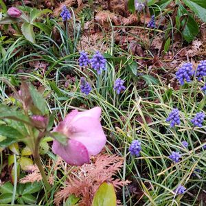 おはようございます。4月の気温にびっくりです。ムスカリも一気にお花丈がのびました。クリスマスローズとのコラボ。お気に入りの空間です。