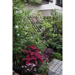 ◆いつもの箱庭 ポツポツ咲き始めたワルシャワニキ(クレマチス)とパープルファウンテングラス!! これくらいの草丈の花があれば小さな箱庭では充分見られる庭になる...?!