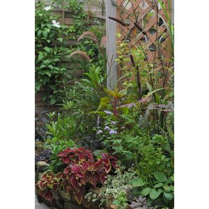 ◆いつもの箱庭 反対側からみたメインの花壇ですが、パープルファウンテングラスとミレットパープルマジェスティが高さの変化を出して、周りを色物の葉物で固めて花は少なめで、クレマチスのパルセット、高性アゲラタム等々... 一番手前の観賞用トウガラシは、植えてみたら横に広がって、高さのある普通の観賞用トウガラシと共に良い味を出してくれています!!