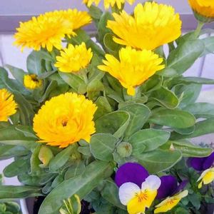 12月に1度載せて有りますが まだまだ元気なカレンジュラで 🏷️イエローマジック💦 取りあえず寄せたビオラとツルニチニソウと🌿🌾 どちらが正面か…ナナメになってます😅 冬場の雨☔の日 寒風吹く日もイエローの🔆明るさで我が家の玄関の蛍光灯です👍