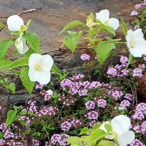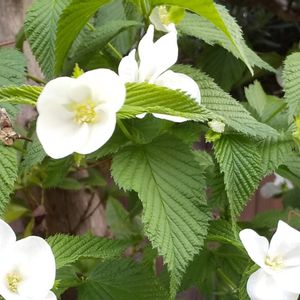 バラ科 シロヤマブキ属 日本 朝鮮 中国に自生する 日本では中国地方 瀬戸内海の山地 (石灰岩地) 兵庫県 福井県など 限られた地域に自然自生する 注) 自生種として国の絶滅危惧種 IB類とされている 落葉性低木 挿し木 実生が容易であり 庭木として 全国に流通 シロヤマブキ属に分類されるのは 本種のみの 一属一種の花木 なお ヤマブキに似ているから ヤマブキとつくが別種とされる 花弁の数 葉のつきかた 秋に4つの黒い実をつける等 ヤマブキとは異なる特徴あり 枝は分枝し茂り 耐寒性 耐暑性さらに ある程度の耐陰性に優れるが 極度の乾燥は好まない 時期に違わず咲いてます。 シロヤマブキの花 派手さはない 楚々とした 品のよさ 野趣味があり 日本の美意識を感じるお花です。 かつて若かりしころ 今は亡き父に頼み 実家の庭に植えてもらいました。 もっとも 頼んだのは ヤエヤマブキなのですが… ヤマブキは花を見て買えと いわれます。 プロでさえ その見分けは 困難だそうです。 一重か八重か はたまた シロバナヤマブキか そうそう シロヤマブキと シロバナヤマブキは 別種ですね。 とんだ間違いで実家にきた シロヤマブキは 同時に植えた芍薬や牡丹 木蓮やライラックといった植物 が枯れてしまっても 今なお咲いています。 画像は実家ではありませんが 株元にイブキジャコウソウが 咲いています。 なるほど 夏場の乾燥や暑さから 守るためでしょうか。 考えられていますね。 昨日の雨はおさまり 今日は晴天 気温も高すぎることなく この時期らしい爽やかさ そんな季節に似合いの花です。 今日1日 お疲れ様でした。