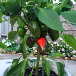 おうち野菜モニターのパプリカぱぷりーな 実がいっぱい成ってるので色づく前に収穫しました🫑 1番小さいのは土の上に落ちてました、お疲れなのかな?!
