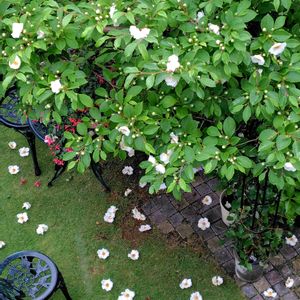 雨降りの週末です、、、 出窓から庭を、、、 バラの花びらがバラバラと、散っちゃって、、😥 ② 昨日GS花友さんのつるバラの誘引についてお話ししてて、、なるべく、横に〜、横に〜、って誘引すると、お花たくさん咲くよ〜、と。 まぁ、成功したかな😉🌹