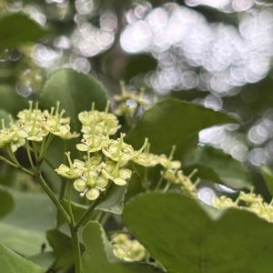 ツルマサキ ニシキギ科 ニシキギ属 つる性常緑木本 花期は6-7月、花は4弁花で淡緑色、花弁の長さは2mm、花の径5mm。