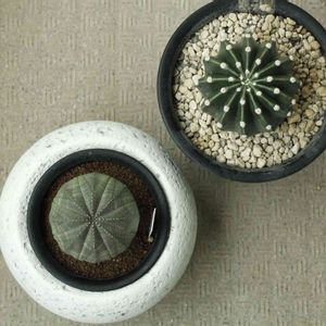 新しい鉢をGETしました♪ 白のセメントの鉢を2つ♪ 1つは前より大きい鉢にガジュマルを植え替えました! もう一つは新しい家族 株分けしてもらったアロエちゃんのお部屋になりました♪ すくすく育ってね♡
