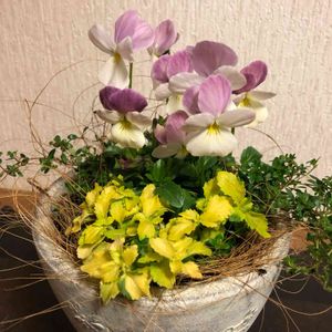 春らしい寄せ植え😸 セダムは、開花を待たずに見切り発車しました。 ヒナソウが、イオノプシジウムだと教えてもらいました。 @春イチゴ さんありがとう😺