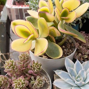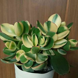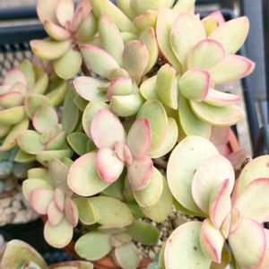 花月錦 別名 丸葉花月錦 クラッスラ属 葉っぱのまわりに赤いアクセント😊 お花は咲くの❔…🤔