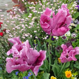 チューリップ・ブルーパーロットです。昔は、チューリップの中で一番青に近い色といわれていた品種です。現在はもっと青っぽい品種も沢山出ているとは思いますが💦オウムの羽のような形で咲くパーロット咲の中では一番好きな品種です💙😍青というよりは、ピンクがかった紫というか、モーヴ色というのでしょうか?そんな色です😅でも、昔々、青いチューリップというのに憧れていたころには、衝撃的な色だったんですよーヾ(≧∇≦)ノ