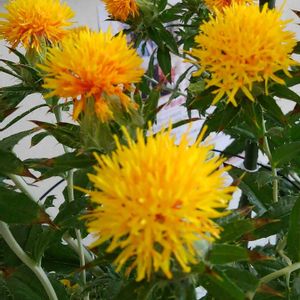 💛今日のお花💛ベニバナです 棘があり収穫大変ですね サフィニア コデマリは友達のお庭です💓🤍☘️