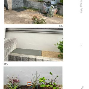 道路沿いの花壇を整理🧹 元々生えていた小手毬⁈を抜根、真夏の太陽🌞や西陽でカラカラになってしまう紫陽花を移植しました。 【左奥】 •アルテルナンテラ(レッドフラッシュ) 【左手前】 •斑入りヤブラン 【真ん中奥】 •パープルファウンテングラス(ペニセタム セタケウム ルブラム) 【真ん中手前】鉢から移植 •トレニア•ブルーインパルス 【右】他花壇より移植 •紫陽花(黒軸ハイドランジア) ※🧐ヤブラン、位置ずらそうかな?アルテルナンテラに被ってる