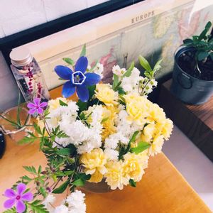 お庭仕事終了 選定したものでまたまたミニミニブーケ^_^ 園芸種ではない山野草のオダマキは どこからか種がきて自然に増えたもの