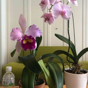 共演叶いました🎶 胡蝶蘭が最後の蕾をゆっくり開花させ カトレアの開花に合わせてくれた😳 カトレアさん、葉っぱ 折り曲げてしまい申し訳ない😥