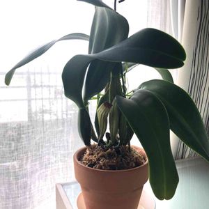 Lc Irene Finney シースが完成しました 今月はバルブが太るのを待ちます 今季2回目のP肥料(バットグアノ)与えました 9月に入ったので水やりを少し減らします 5号鉢 2006〜 バルブ数10本 葉7枚 今年の葉は長さ31センチ 葉の重さでバルブが傾いています😅