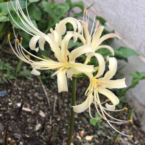 何十年も住んでいますが、、白い彼岸花が咲きました🌸彼岸花とは言わないかな? 植えた覚えないです💦 赤い物はあったけど消えてしまって、、何処から来たのかな?