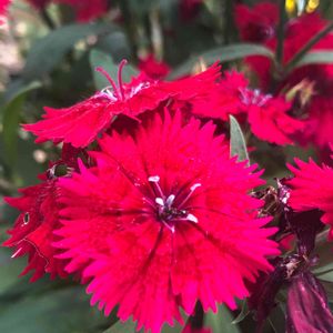 この花はナデシコかな? 今日は下り坂! 曇っていて☁️冷たい風が吹いてます。 寒いかな。、、 赤いお花を見て暖かく🎵🌿