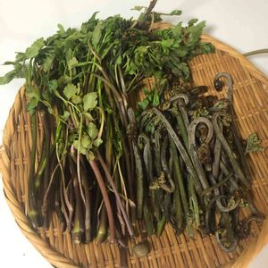 母が持ってきてくれました。 ワラビとむかごも一個、、この萎れたのはなんだろ?セリの匂いはしません。