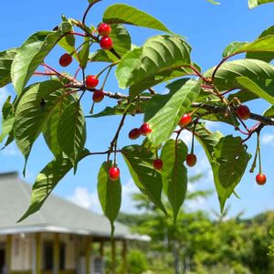 足柄ふれあい公園の金太郎桜🌸のさくらんぼ🍒の初実り 昨年植えたばかりの地元の桜が咲き、可愛い赤い実が 散歩道の入り口で,小鳥に気が付かれてないみたい⁉️