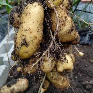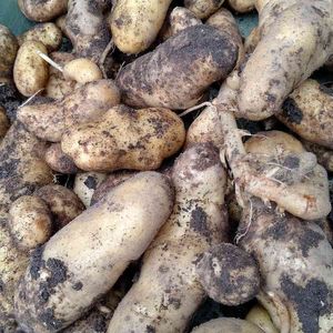 長雨大雨の前に、急いで掘った、ジャガイモ🥰 4株で、こんなに🤩 種芋を植えたとたんの長雨で、腐ってしまって、残ったのは4株だけ😅 期待以上の出来でよかったわ🤩 😳😳😳😳 でも、形が変形した「こぶいも」がありますね😂 🌱二次生長してますね😂 🌱肥大最盛期に高温乾燥で休眠状態になったジャガイモが、その後の降雨や低温で休眠が破れ、再度肥大した😭 🌱梅雨入り宣言したのに全然降らなかったけど、その後、大量ではないけど、降ったよね😂 その時に、二次生長したんだ‼️ 🌱来年は、葉が枯れ、倒れるのを待たずに、 梅雨入り宣言されたら、早々に掘った方が良さそうだね😁 今、ジャガイモ高値😱 新型コロナによる巣ごもりで最高値、 平年より7割以上も高いとのこと 上手に保存して、大事に使おう🥰