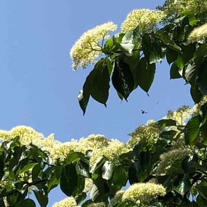 「ミズキ(水木)」 青空に白い小花の集まった花が広がる。 樹高は20メートル位かな。 2021.4.20撮影