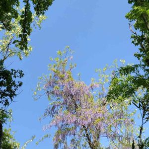 「ヤマフジ(山藤)」 ハリエンジユを見上げたら、その向こうにヤマフジが見えた。 つぼみが飛んできて、ここに咲いているよーと教えてくれる。 左巻きのつるが特徴。 2021.5.1撮影