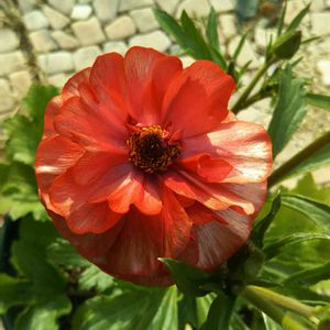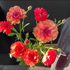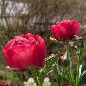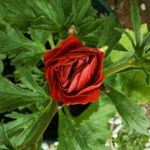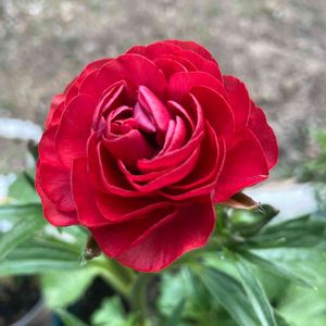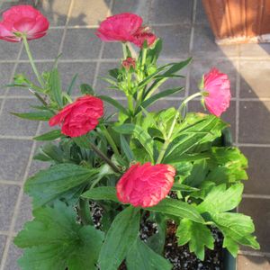 こんにちは👋😃 ラナンキュラスラックス ムーサ。 艶のある赤い花が、咲いています。 1.2番花を、カットして今は、3番花が、小さく咲いています。 次の艶が、赤く色づいてきたので太陽に、あてています。 道の駅、葉菜の森で、 買いました。