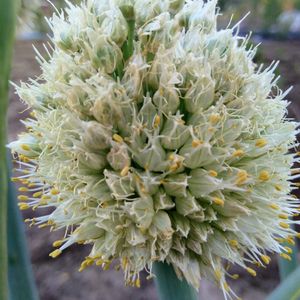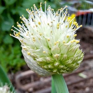 畑のネギ坊主。ネギ坊主は小さな花が集まって球状になったもの。