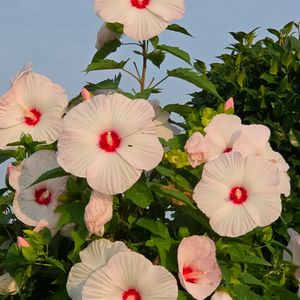 ( *ˊᗜˋ)ノこんにちゎ〜ꕤ 🌸 タイタンピカス 🌸 ꕤ︎︎ ピーチホワイト🌺 ꕤ︎︎ꕤ︎︎ 今年は 見上げる高さに 伸びてしまいました 😅 ꕤ︎︎ꕤ︎︎ꕤ︎︎ アルテミス🌺 こちらは 今年もコンパクトの丈で 横には 広がってますが 🤭 午後も ガンバです♡o(´∀`o*)