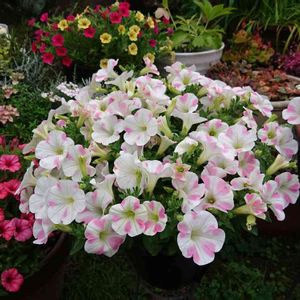 ✲゚*•(*・ω・*).•*¨* ✲゚おはようございます❣ 今朝は雨がやみ、晴れています🌞🌞 鉢物を軒下から庭へ戻しました🌼🙆 サフィニアアート ももいろハート😍😍さん 初お迎えですが、モリモリ❤️になってきました ◟⌣̈⃝◞♡ヾ(๑╹◡╹)ノ"