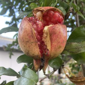 家のざくろの木に2個実がなっていました。 絵手紙に書けそうな感じ。