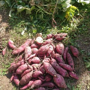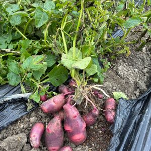 お嬢と一緒に掘りあげれました😊 今年は試しに出来るだけ横に寝せて寝せての植え方で。狭い畑なのでほぼ間隔空けず詰め込みで。 虫の被害もなく、大きさもほぼ揃ってて成功です👍 2枚目は苗を作るために植えていた親芋にできてたさつま芋。 でかい芋が育ってましたが美味しいかな? 筋がありそうな気がする➰🤔