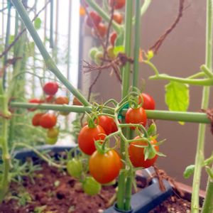 憧れの房どりミニトマト🍅🍅🍅 収穫まで後少し‼️ 特に1番上の子→がんばれ〜🩵 この子たちはカゴメのぷるるん🍅 薄皮タイプなので 割れないようにがんばれ〜💪 そして水耕栽培中の ミニトマトねねちゃんも収穫🍅 連日の30℃超えで 水耕栽培の根っこが軒並み 茹でられててもう元気ない💦 室内に置くとこないし… 流石にもう無理かなー?