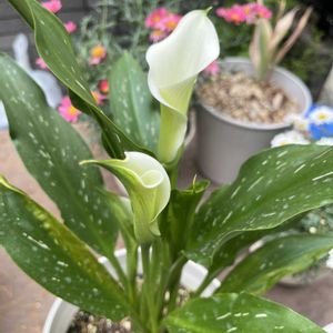 ①カラー綺麗な白.◌𓈒𓏲𓆸🤍になってきました。 ②シャクヤク一輪だけでも華やか。 ③④紫陽花(ラグランジアブライダルシャワー) ⑤カモの親子🦆🦆 この紫陽花は最後には薄ピンク🩷に色付くそうです 枝垂れになっていて初めて見ました😳