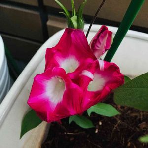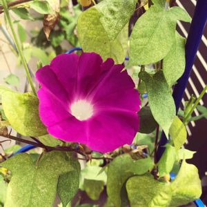 ベランダの柵に這わせた朝顔💕 日当たりが良いからか、外に向かって咲いてくれるので、こちらからお顔が見えないのは残念だけど、通る人を楽しませているならいいかな…