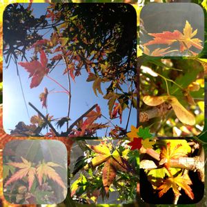 我が家のイロハモミジ🍁 まだ深緑色が多く まばらに色づきかけ 光線が葉を通し葉脈に色を添える(右上・下中) 種子のプロペラも付いたまま(右中) 先日軽く剪定✂🌿したので 枝間から空が望め 寒暖の繰り返しで 新芽も出てきてる(右下) 2025.11-44
