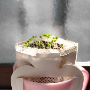花のあるお家時間キャンペーン🌱 ドリップパックでハーブ育てるキット☕ 芽が出てきました🌱 これはレモンバーム🍋 どうやって使うんだろう…🙄