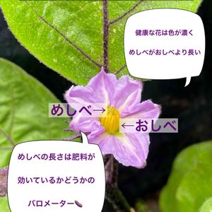 【 種からのトゲなし千両なす 】 🍆めしべがおしべよりも長くなっているときは肥料が足りている証拠。 🍆逆に、めしべがおしべに埋もれて見えない時は肥料不足のサイン💦 なすの調子がイマイチなので、調べていたら、花の話がたくさん載っていました✨