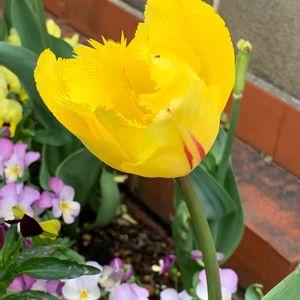 チューリップ フラメンコ🌷 3球くらい植えて、咲いたのはこの子だけですが、綺麗な黄色でフリンジもいい感じに咲いてくれました😊 日当たり不良な花壇… チューリップは、植えた分の半分は咲いたかな?という結果になりました🥲 来年の参考にしたいと思います😌