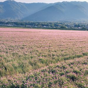 近所の畑。天気もよくて青と緑とピンクの3色がとっても綺麗です☀️🌸😊