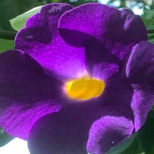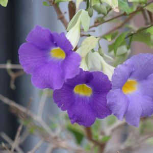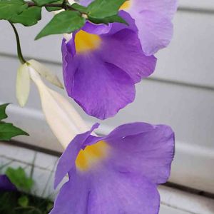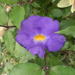 ツンベルギア{矢筈葛(やはずかずら)} 紫味を帯びた美しい青い花びら💜💙と花芯を囲む黄色💛のコントラストが鮮やか❣️ 《名前の由来》 矢筈(ヤハズ)って❓ 弓のつるに矢をかけるためにV字型に切りこんだ部分の名前で、和名は花を挟む2枚の苞がこの形に似ることから🏹🇯🇵🥀 実は、ツンベルギアも、わたしには難しい〜😝と思ったのですが、日本の植物学の発展に貢献した植物学者ツンベルクに由来する由緒正しいお名前なのでした😅(でも、たぶん覚えられない〜( › ·̮ ‹ )) アジアの熱帯・亜熱帯地方とマダガスカルおよびアフリカの中南部に自生しているそうです。 キツネノマゴ科 ヤハズカズラ(ツンベルギア)属