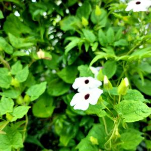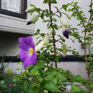 鉢植えの ツンベルギア お庭で咲き始めました、冬は室内出窓に置きます。