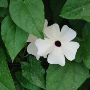 【ツンベルギア】《キツネノマゴ科》 花言葉は「黒い瞳」「美しい瞳」 別名: ヤハズカズラ(矢筈葛) 属名の学名「Thunbergia(ツンベルギア)」は、スウェーデンの植物学者カール・ツンベルク(Carl Peter Thunberg / 1743~1828)の名前にちなみます。 ツンベルクはオランダ商館付医師として出島に赴任し、鎖国期の日本に1年滞在(1775~1776)。日本における植物学や蘭学の発展に寄与した。 葉はハート形で矢筈(矢の末端の弓弦を受ける部分)に似ていることから和名では「矢筈葛(ヤハズカズラ)」と呼ばれます。 花の中心に目玉のような黒点があることから英語では「Black-eyed Susan vine(つる性の黒い瞳のスーザン)」と呼ばれます。 2021.6.9