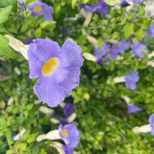 おはようございます☀️ 今朝のお花は ツンベルギア💜 今年初めて育てているので 花の色 形 伸び方 全てが新鮮🎶 6月に咲いた時は 鉢の表面で咲く程度でしたが 真夏に伸びて伸びて🌿 ずいぶん大きくなりました✨ 一年草と書いてあるけど🤔 この辺りでは冬越しできるかな💕