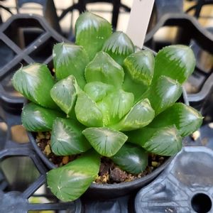 ダイソーハオルチア 枯れかけから半年でキラキラに✨ ミイラみたいに茶色くペッタリしてたのが、ちゃんと水を吸うんですね😲 徒長も葉数が増えたら気にならなくなりました😆 これはオブツーサっぽいですが、他の種類の購入例もあるようなのでいつか出会いたい😊