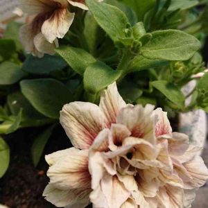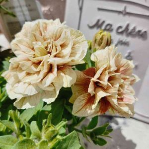 この子も先日我が家へ(^^) ラベルには、 栄養系ペチュニア ホイップマカロン ショコラブラン プレミアムカラー ん〜ん、覚えられません😅 名前はとにかく、おとなしくて気品ある花いろです💕