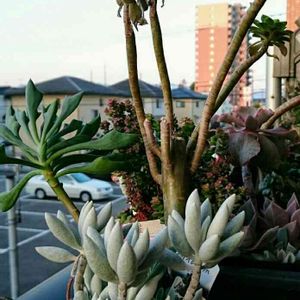 今日は久しぶりに、朝からお日様が🌤 皆さん、いかがお過ごしですか🍀 写真奥から、エケベリア×2、銀月、そしてかねのなる木🌱