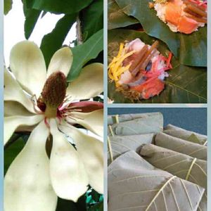 朴葉の木のお花 白く大きく開きました💞 葉っぱで酢飯、いろんな具ざいを乗せて包んで 朴葉寿司を作りました。 季節のお楽しみ💚
