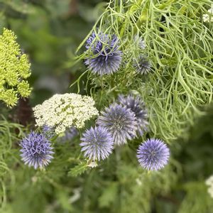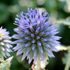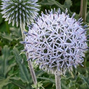 【ルリタマアザミ(エキノプス)】 地中海沿岸~西アジア原産、キク科多年草 真直ぐに伸びた茎の上にまん丸の蕾をたくさん付けて、神秘的な薄紫色や青色の花を咲かせる。 球状の花は多数の小花の集まりで、球の上のほうから順に咲き、花が散ったあとも球状の形が長く残る。 アザミの名が付くが、アザミの仲間ではない。 草丈:50~150㎝程度 花色:青、紫、白 開花時期:7~9月 ときわ公園@宇部市